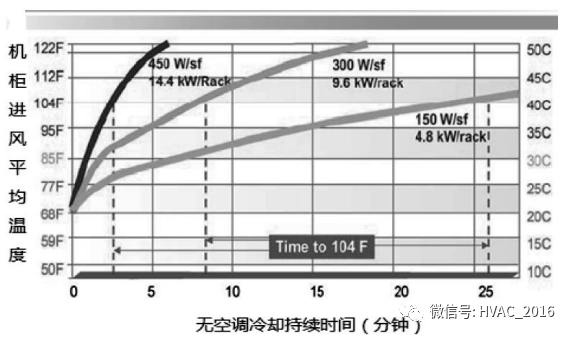 數據中心業務中斷對不同的行業會造成不同程度的影響,例如導致公司銷售停頓、生產停止、服務無法正常提供等。來自網絡的統計資料顯示,過去的5年內,發生的13次服務器宕機導致了568h的服務中斷,造成了超過7170萬美元的經濟損失。IT設備的正常運行,不僅依賴電氣、網絡等配套設施的穩定運行,也依賴空調系統不間斷可靠的運行。以往數據中心規模不大,密度不高,機柜密度只有1kW/機柜~2kW/機柜,即使制冷偶爾中斷,對IT設備的運行也沒有多大影響,因此數據中心的建設者往往忽略了制冷中斷的危害,只關注供電系統的設置。隨著科技進步和時代發展,數據中心的規模越來越大,機柜密度越來越高,一般為4kW/機柜~10kW/機柜,甚至高達30kW/機柜,一旦制冷中斷,服務器的進風溫度就會迅速攀升,可能只需要60s甚至更短時間(取決于熱密度),就會達到破壞性水平,引發宕機或設備毀損釀成事故。某一機構在實驗室條件下對不同負載條件下制冷方式發生中斷時,環境溫度的變化過程進行了現場測試和統計,如圖1所示: