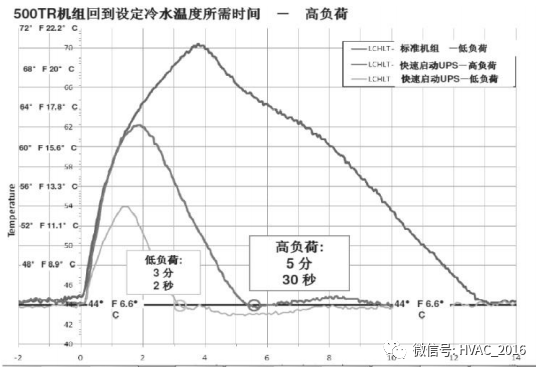 不同的系統,制冷中斷后再恢復的過程也是不同的,恢復時間也有區別。對于大規模數據中心常用的離心式水冷供冷系統制冷中斷時,冷水機組重新啟動到恢復事故前狀態所需的時間在制冷系統恢復時間中權重最大,這也是針對數據中心項目,很多冷水機組生產商不斷開發快速啟動型設備的重要原因。圖2是某離心式冷水機組廠商提供的不同類型的冷水機組重啟期間供水溫度變化曲線。從圖2可以看到,標準配置的冷水機組重新啟動到恢復正常供水溫度需要13min左右;配備了快速啟動模塊的離心式冷水機組,重新啟動到恢復正常供水溫度僅需3min~5.5min。盡管配備快速啟動模塊的冷水機組的恢復時間遠遠優于標準機組,但仍然無法滿足中高密度數據中心對不間斷制冷的要求。