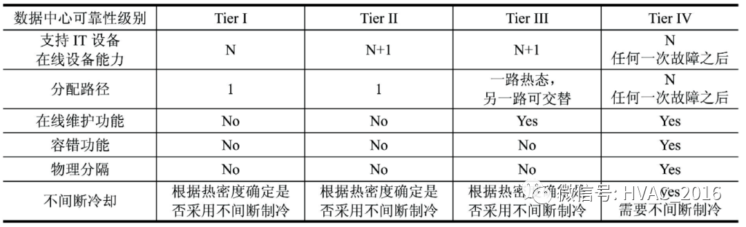 所謂不間斷制冷(continuous cooling)是指數據機房始終保持正常的溫濕度,不受任何事件影響。數據機房是否需要采用不間斷制冷裝置,主要依賴于數據中心的可靠性級別和用電密度。國際正常運行時間協會(The Uptime Institute)是一家致力于為數據中心行業提供認證、信息技術產業研究、技術咨詢等服務的會員組織。該組織率先提出數據中心的4級(tier1-tier4)分類方法,在業內影響深遠,其發布的白皮書對不同級別數據中心的基礎設施配置有明確要求,詳見表1。在白皮書中,要求TIER4級別的機房必須設置不間斷制冷設施,tier1-tier3級別的機房應該根據熱密度確定是否采取不間斷制冷設施,通常機柜平均密度大于6kW/rack的數據中心應采取不間斷制冷措施,對于冷凍水系統應配置包括設置蓄冷罐、精密空調風機和冷凍水循環泵采用UPS供電(冷凍水系統采用一二次泵系統時,僅為二次泵配備UPS供電即可)。