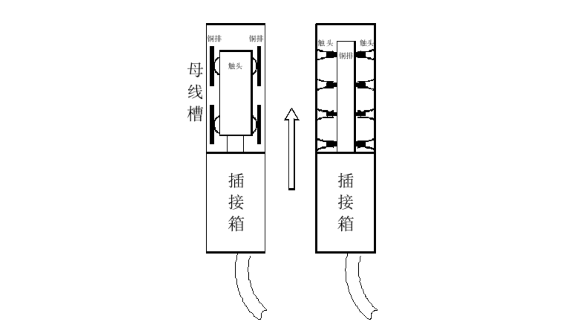其插接箱從垂直方向安裝,插接箱固定在母線槽底部。