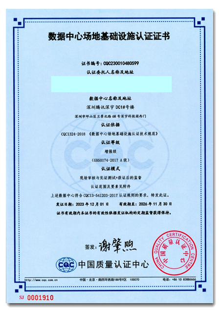 近期,英和數據成功完成了深圳騰訊深宇數據中心 1 號樓項目的驗證測試工作,并助力該數據中心獲得了中國質量認證中心(CQC)頒發的國標 A 級認證證書!